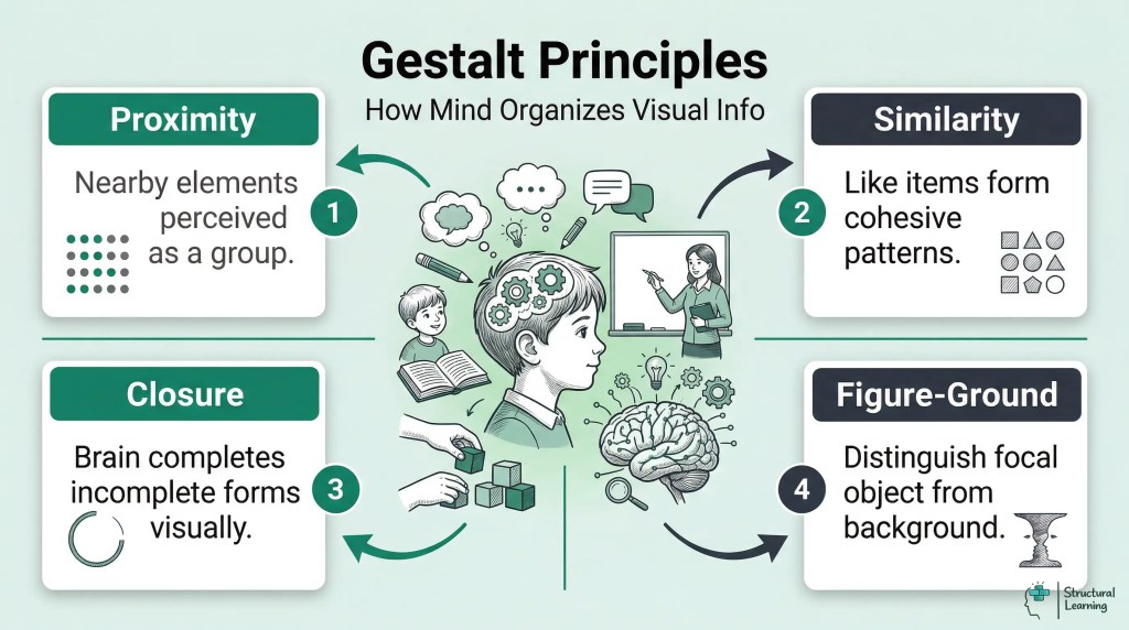 Gestalt psychology explains how the brain groups visual elements. Several Gestalt principles are especially relevant to web design.